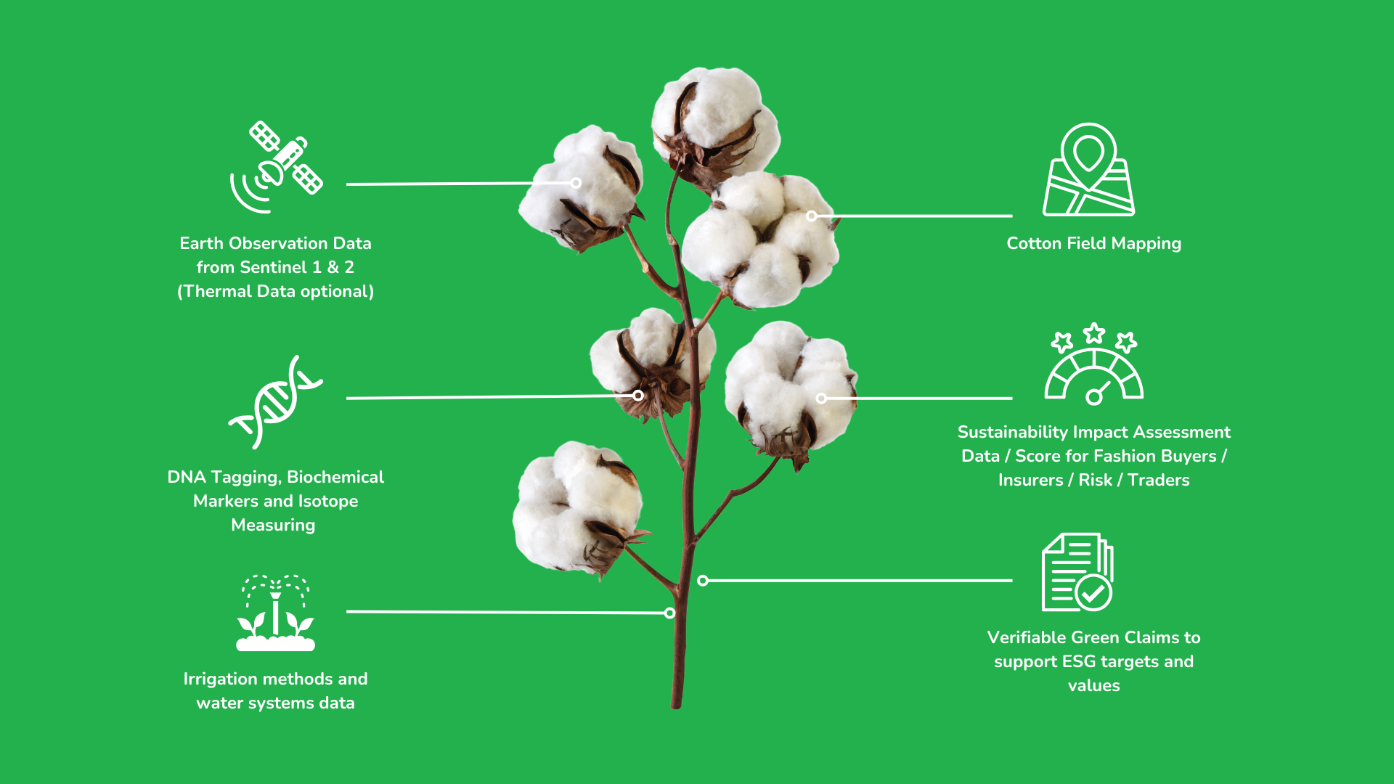 CottonConscience uses data from EO Satellites, DNA Tags and known water sources to create an impact assessment of the cotton at field-level. This assessment is presented to the user (Fashion Buyer) via an integrated platform within their buying system helping ensure their buying decisions align with their company values, ESG targets and sustainability KPIs.