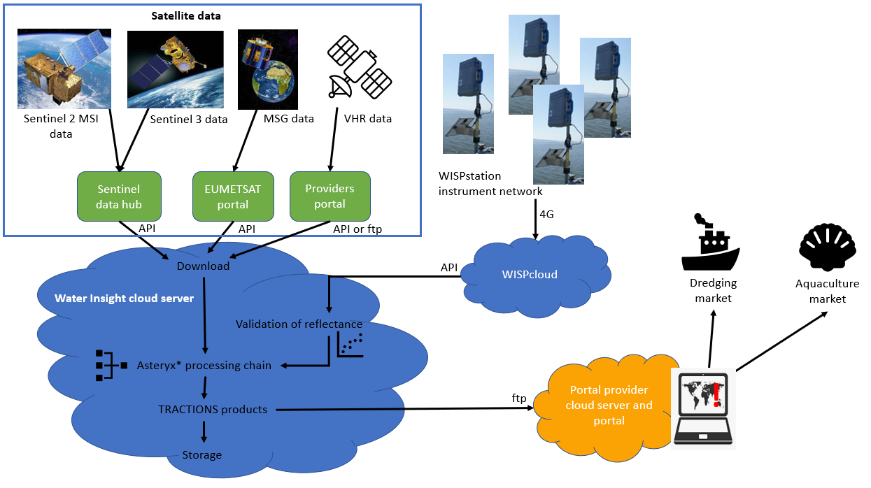 Regional and daily satellite data (Sentinel 2, 3, Meteosat and VHR) are downloaded to the Water Insight cloud server and processed, validated and converting to TRACTIONS products via the Asteryx* processing architecture.