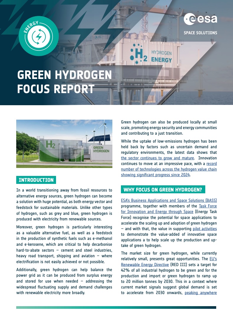 As we transition away from fossil resources, ESA's Green Hydrogen Focus Report dives into the huge potential for space applications to accelerate the adoption and scaling up of green hydrogen. |