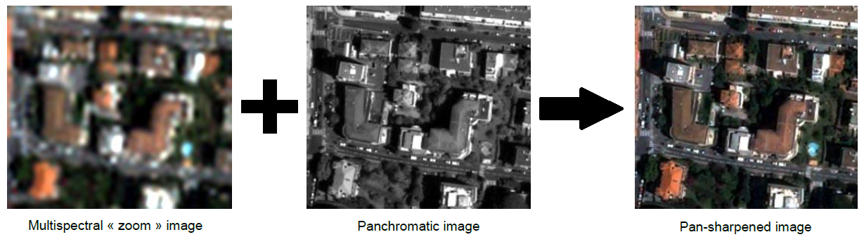 Figure 4: Example of Pan-Sharpening (Source: http://www.cscrs.itu.edu.tr/assets/downloads/PleiadesUserGuide.pdf)