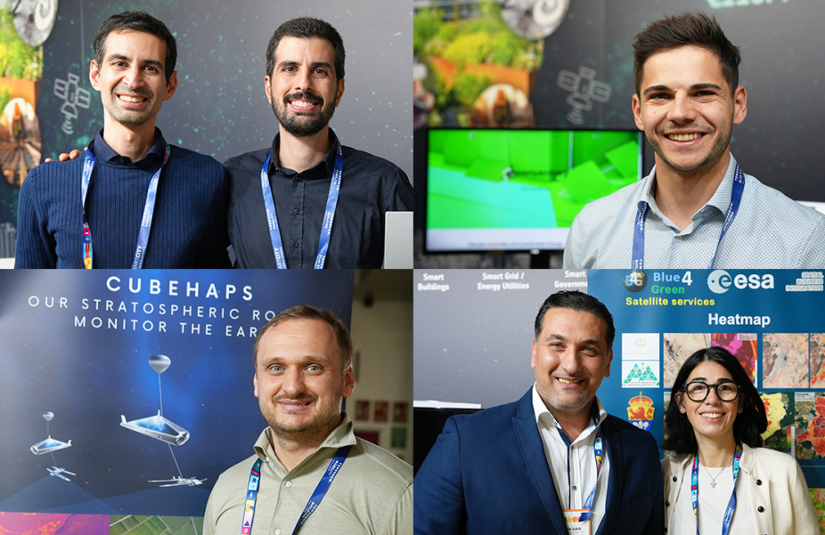 Pictured clockwise from top left: Luca Leomanni and Simone Leomanni (Social Tech Projects), Stefan Beck (greenventory), Victor Miherea (Stratobotic), and Layth Sahib (Spatial Business Integration GmbH) with Beatrice Barresi (Senior Sustainable Applications Officer at ESA).