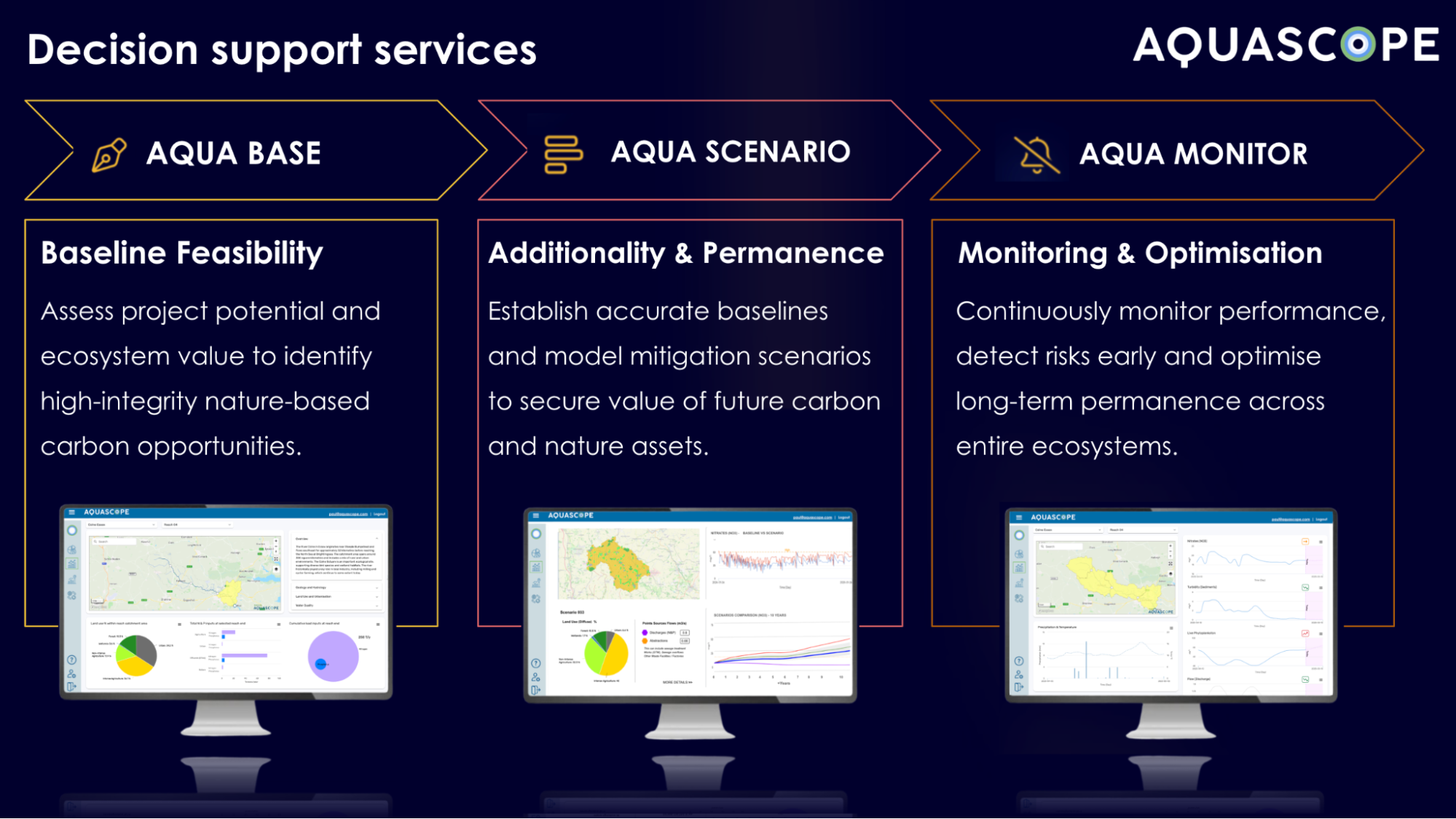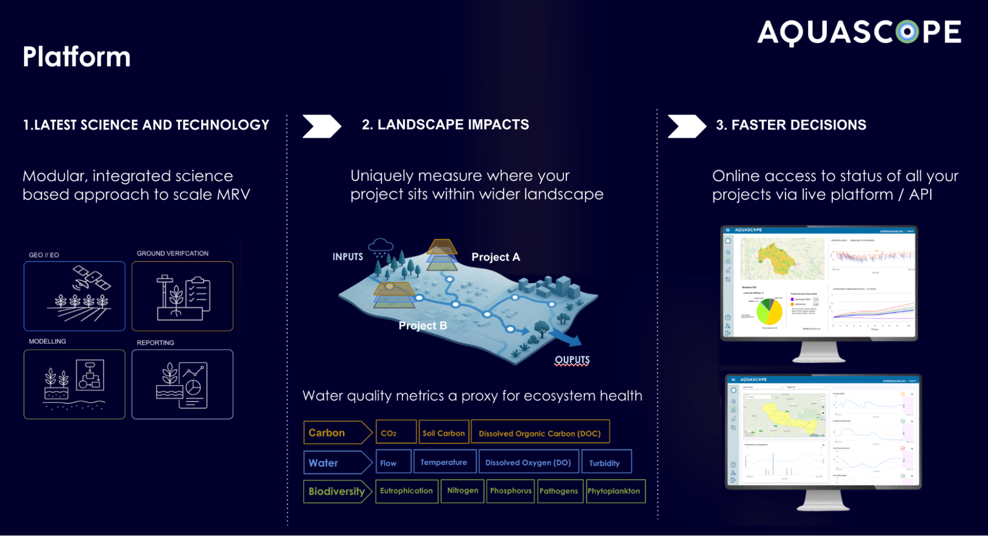 Platform overview summarising the business delivery workflow and our focus on validating and monitoring carbon and water assets: