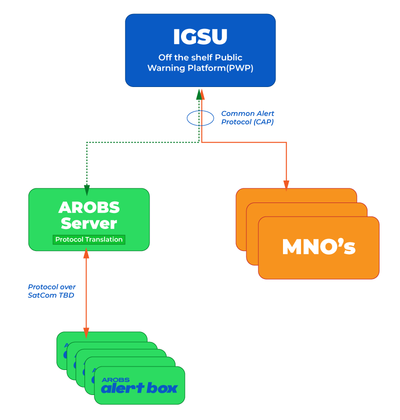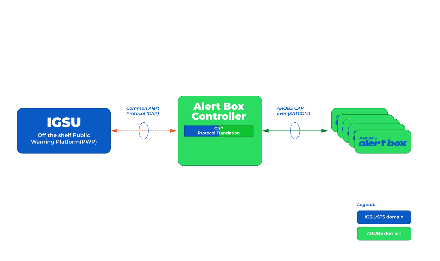 In compliance with authorities' infrastructure and security constraints, the system comprises two primary subsystems: a user-accessible stand-alone device box (AlertBox Device) and a dispatching and control server (AlertBox Controller). The AlertBox device displays relevant alerts for its location and allows users to send predefined emergency alerts to authorities using Iridium or Starlink satellite communication system.