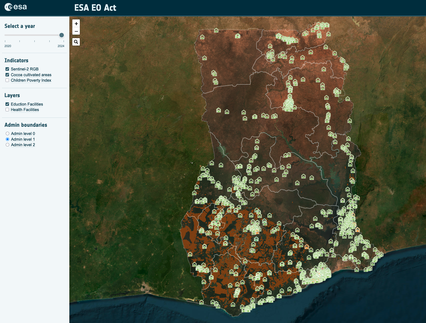 We finalised a demonstration platform allowing to visualize these the percentage of children living in extreme poverty on cocoa producing regions, along with other relevant indicators, such as the presence of educational/health facilities (see Figure 1)