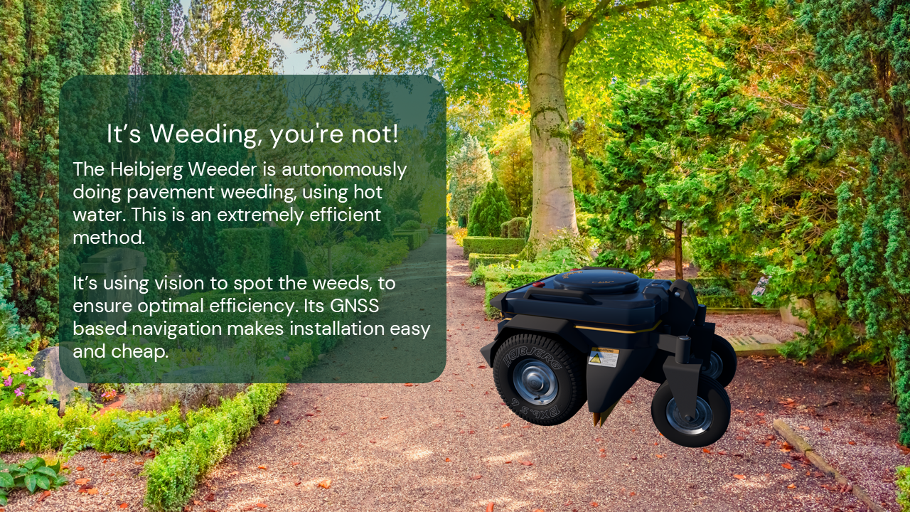 Heibjerg is developing an autonomous robotic solution to address the labour-intensive task of weed control in gravel and stone-paved areas, commonly found in cemeteries, housing associations, sports arenas, and parks. The current challenge for users is the high cost and time-consuming nature of manual weeding, with sites requiring 10-12 treatments per year, amounting to approximately €10,000 per hectare annually. Labor costs are the primary driver of these expenses, even when using specialized equipment.