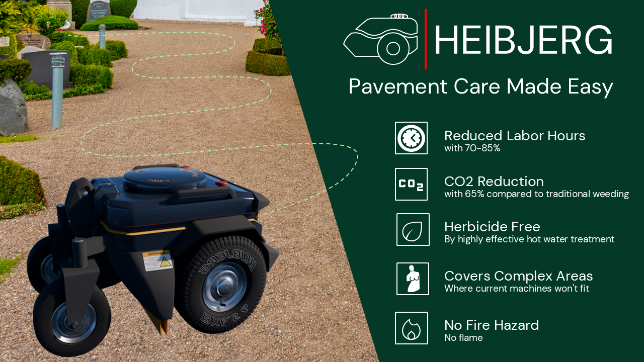 The Heibjerg Robotic Weeding solution is designed primarily for garden professionals, groundskeepers, and facility managers who oversee weed control on larger sites such as cemeteries, parks, and housing associations. These users face a growing set of challenges, including stricter herbicide regulations in many EU countries, the extended weed season due to climate change, and increased fire hazards from traditional weed burners during dry periods.