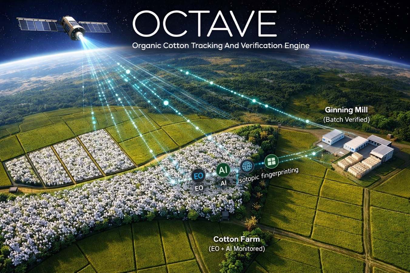 In simple terms: OCTAVE monitors cotton fields from space, checks for unusual patterns that suggest non-organic practices, validates origin with lab tests, then links verified farm outputs to ginning batches to prevent undeclared mixing, creating a tamper-resistant chain of evidence.