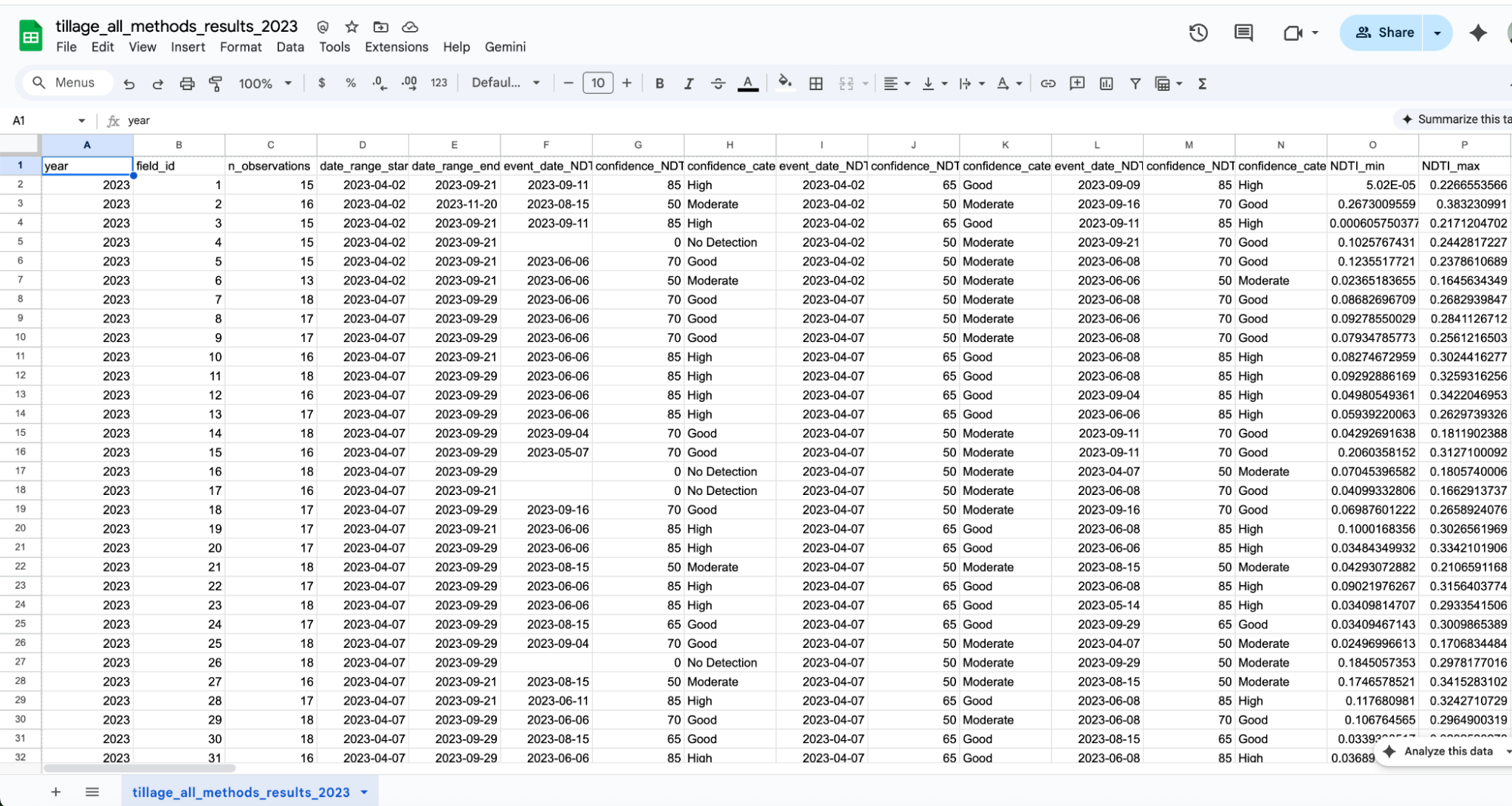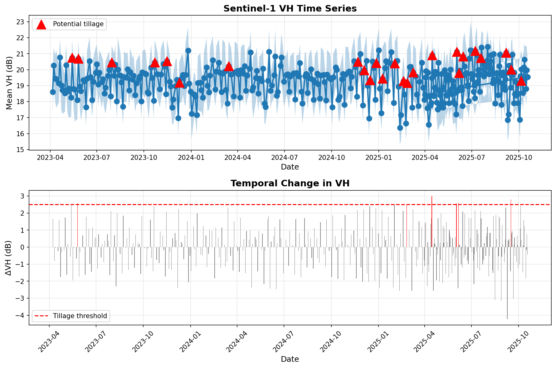 Automated tillage event detection with dates and confidence levels (target >80% accuracy)