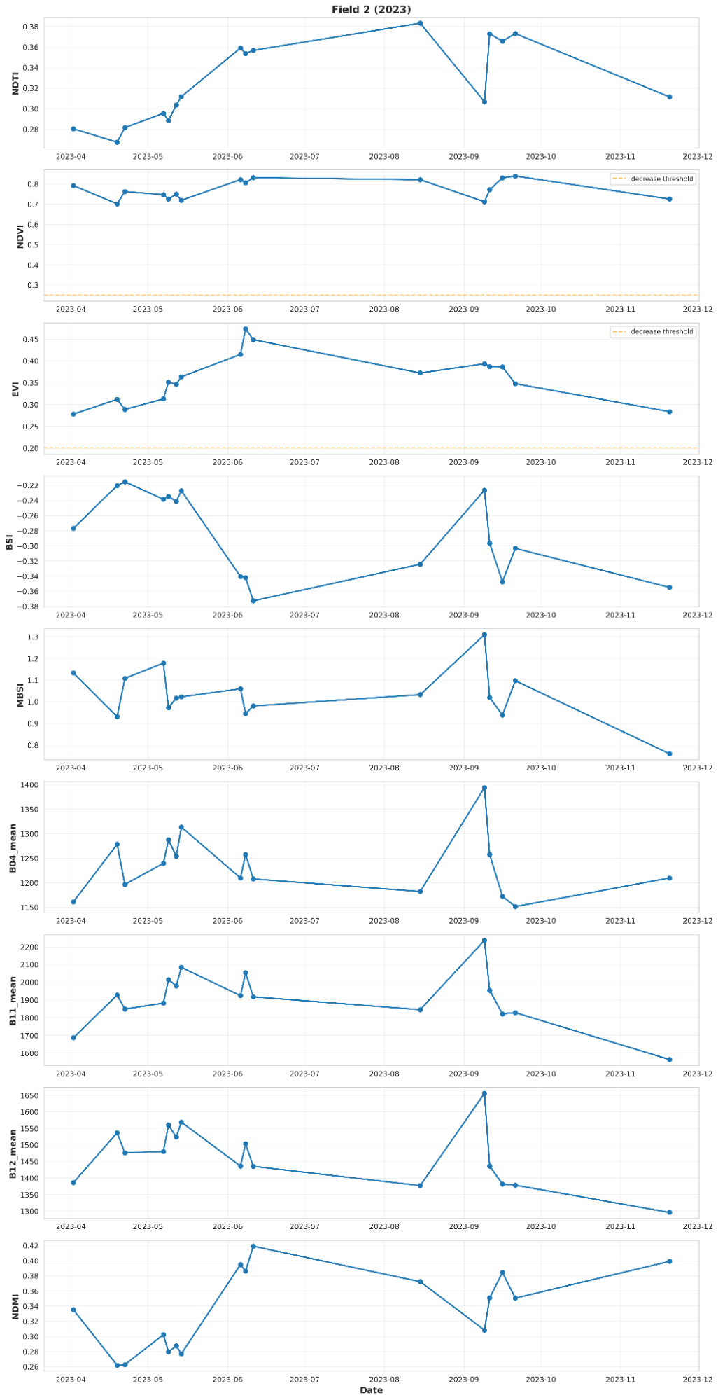 Multi-index analysis (bare soil indices, soil moisture, vegetation change)