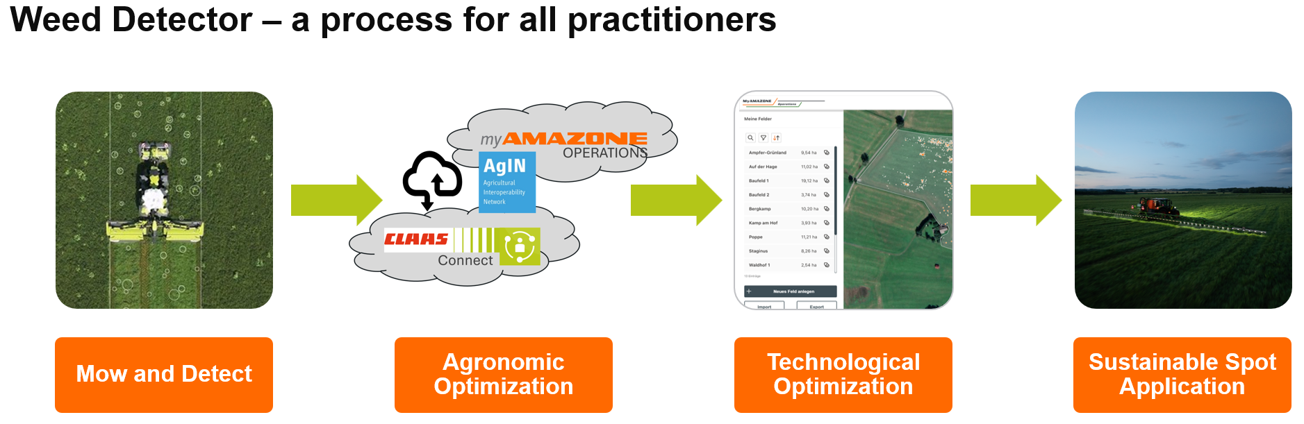 Weed Detector is the practical solution for detecting harmful plants in grassland directly during mowing. The first step is to detect rumex obtusifolius. AI-supported software detects rumex plants using two cameras on the front mower. The detected rumex obtusifolius leaves are transmitted to CLAAS connect as georeferenced target areas. The farmer can apply a treatment-rate (l/ha herbicide) to the locations found at several points in time to ensure effective treatment. The standardized map of the agronomic target areas is transferred to myAMAZONE operations in future via the AgIN interface (AEF), today via manual transfer. Depending on the spray technology available, the application rates are calculated in advance. Due to the short switching times of the new PWFM technology AmaXact, the spot size can be reduced compared to conventional single nozzle switching, or higher driving speeds can be used. Finally, the spot application map is transferred to the AMAZONE field sprayer and the rumex obtusifolius is controlled selectively and sustainably with maximum efficiency.