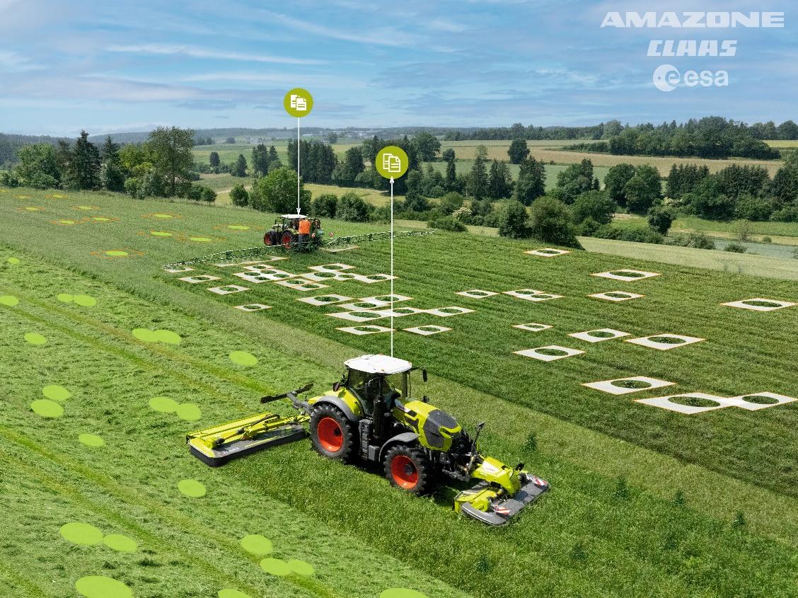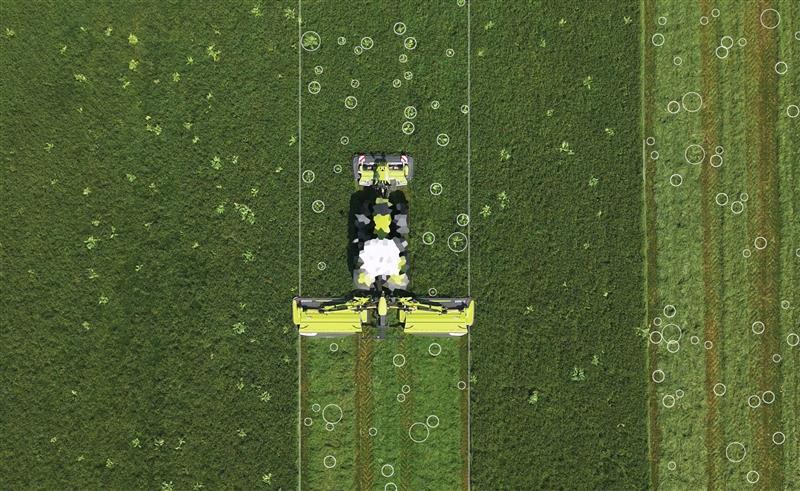 CLAAS detects rumex obtusifolius during mowing with the Weed Detector. The camera system on the front mower covers a working width of up to 11 meters, AI analyzes the images live, and the farmer adds the location-specific safety zone in the FMIS. The maps are transferred to the AMAZONE cloud, the application rates are precalculated, sent to the operator terminal, and the herbicide is applied only in the spot.