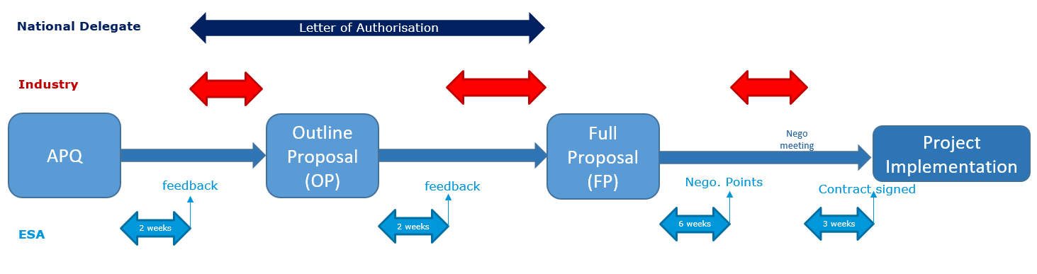 The duration of the end-to-end process is different from project to project and it depends on the time taken by the applicant team to prepare the OP and FP, as well as any necessary iterations. The following diagram aims to give an overview of the different steps and the expected response time from ESA.
